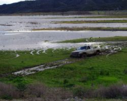He asked us rather politely if we would help by driving around to come down to the water level and help pull them out. We said we would and turned around to look for the road or a track down to the lake. Not seeing anything but motorcycle tracks, we went all the way out to Bartlett Springs Road, turned left and headed towards one of the old boat ramps. We poked around and found a track that headed in the right direction.