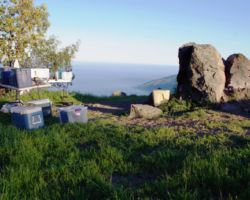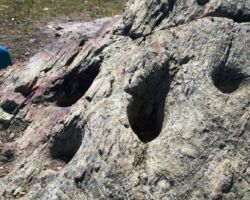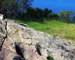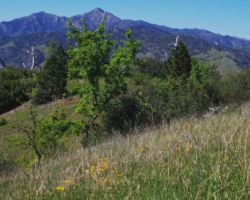 The clearing was circular, occupying a large portion of the inner loop of the road. On the left/South side was a shallow depression that could be seen despite the tall grass. It could carry water in the wet season, but now just looked like a grassy nook. At the end of the nook, just before the hill gave away sharply, was a massive White Oak spreading its massive arms perfectly, with many smaller limbs in a very vertical habit. Most of these then came within feet of the ground and turn upwards, giving the impression of a Chicago horn section. A few feet from the tree, higher up on the flat ground was a large rock, 6 feet around and 4 feet tall. It had 5, 6, 7 grinding holes of various depths but all about the same diameter. The rest of the area, roughly 100’ in diameter was short grass, as if it had been mowed. It was much shorter than the natural grass in the low spot and mush shorter than the grasses on the hillside that dropped off to the West. Just about smack dab in the middle of the entire area, was a rounded knob of bare gravel where no grass grew. This was the high point and about the center point of the opening and although there were very few truly level spots, it was incredible to find such a large open area vacant, not up against the road, with some shade, with the grinding rock, and with the best view of the ocean you could imagine.
