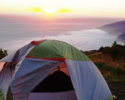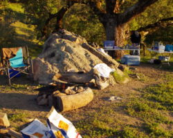 We maneuvered the rig over to the grinding rock and unloaded and hunted for the most level spots to put our tents. I ended up near the ravine under the oak tree set back from the edge a little with a mottled ocean view through the massive branches of the oak tree. Steve went for full view perched out in the open on the edge of the precipice. We were unloaded and pulling the truck out away from the camp so we didn’t feel it so much, when a rig came down the road and slowed to check out our spot. I was glad I was in the rig moving it as it may have given the impression we were occupying more of the total area than we were, as 70 % of the clearing was vacant – not being near the edge with the view but below the rise from the high point in the middle to the road.