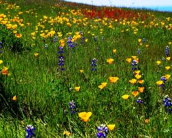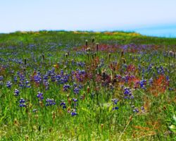 We stopped in an open ridge, covered in wildflowers with a short track leading to a spectacular camp site. There was no cover, shade or shrubbery, so it was very exposed, but that also made it a super spectacular setting. Plus, the site was surrounded by and covered with wildflowers; purple and blue Lupine, Poppies galore, and patches of deep red – maybe Delphinium or a sage. I am certain I heard Julie Andrews or Steve warbling out a melody uplifted on the coastal thermals. If not for the wind, and perhaps a few degrees cooler, maybe a tad of cloud cover, this spot would make an excellent home. Although much farther down the slope, it did not have the wide open views of up above. But it did look right out to the ocean, and you could see more details of the coast line, maybe even hear the waves on accession.