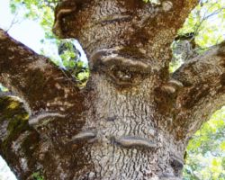 As we left the high mound camp spot, we could look out and see into the crown of the White oak. I had to take a double take for a moment as I thought I saw a bunch of monkeys high up in its branches. Perhaps I did. We drove to the bottom of the mound, back to the main road and up to the White Oak. Just then about 6 guys were jumping down out of the tree. They were all young, healthy, trippers, most with really long hair and shirtless.