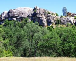 We drove a short loop road that comes along the back side of the rock and along Santa Lucia Creek. It is not a campground having no water, table, rings, etc., but it does get used as such and for good reason. There are numerous large oaks spread over large flat open grassy meadows. There are cows to be sure, but they may be kept on the North side of the road. There are a few other short roads or spurs that head down to the creek for other dispersed camping spots near the creek in the 5 mile stretch or so of road between the NF-HL boundary and the Santa Lucia Memorial Park that enjoys a fantastic setting at the head of the valley and the confluence of several creeks draining the higher elevations of the Santa Lucia Mountains and the Ventana Wilderness. We drove loop Road #4 and stopped at a site above the creek in the shade of the oak to have a little snack and a refreshing beverage. It was a great spot with creek and rock views and no one else in sight. There were perhaps only 3 or 4 other camps set up in the entire area. There were maybe a dozen cars parked at the trailhead by the rock formation, but all the people must have been out on the trail or down at he crick. It is definitely worth a return visit for a prolonged stay.