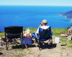 Fortunately, what we did find, was off the charts outstanding. After the disappointment of rounding the bend and ascending the hill to find the tent and 2 chairs parked in our spot, we quickly followed the tiny loop back down the hill, up the other side and out to the hang glider launch pad. This was far too exposed, as one might expect, without a tree, shrub, spec of shade, or hint of privacy. But we picked up another track that launched down a narrow spine, only to come to three rigs parked across the track and a small group perched in chairs on the other side of the rigs, absorbing an unobstructed view of the glistening Pacific.