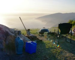 As we rounded the bend and craned our necks to get the first glimpse of our spot, we were crushed to see a tent and two chairs perched on the edge, overlooking our spectacular view and the site of so much fun on the prior trip. There were 6 or more of us on that trip, the first and only on or near the Coast. It was incredibly beautiful, as the Big Sur coast is apt to be. We had the most incredible storm hit us; we watched the thing come in from the Pacific and just smash into us – a big dark mass that didn’t seem to be too much higher than we were at 3,000 above the surf.