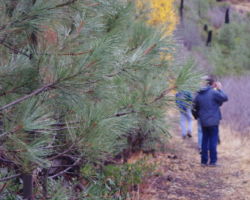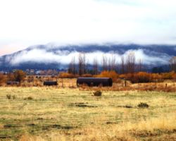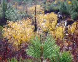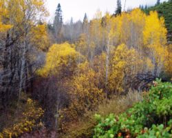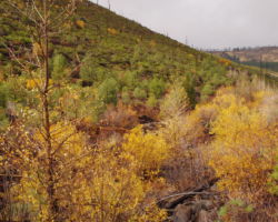 Within a mile maybe, we entered Bear Valley and followed along Bear Valley Creek. Many of the Aspen up this high were already bare, but the leaves that did remain were a beautiful yellow and gold along with the grasses in the meadows, the Willows, and Alders. I started looking for stumps with a cool intact root structure for the yard, and instead I spotted a cool Mountain Juniper log – about 6 feet long and 2 feet wide, mostly rotten in the middle, but still way too heavy to get. While we were out of the trucks, we just saw one cool thing after another. A pile of ashes still smoldering, beautiful Junipers, a stone wheel, 2 feet in diameter and almost perfectly round and smooth on both sides. We spent much time configuring ways to move the wheel, but it, along with the log, would have to wait for another time. The lighting was spectacular with the storm clouds breaking up and the air was as sweet as could be. Everything was clean and fresh and it was great to be out.