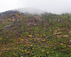There were several stretches where I was not steering the rig, or I was turning the steering wheel, and presumably the tires were changing direction, but it had no effect on the direction the vehicle was moving. There were other times, when I couldn’t keep the rig out of the ruts and once they got ahold of the tires, we were following that path until the rut ended. This muck continues, along with a slight drizzle, for about 4 very slow miles until we reached Bear Valley Campground in the Tahoe National Forest. There we stopped to stretch our legs and ask a couple forest service dudes who were burning piles what the road ahead was like. Reassured we were good to go, we proceeded.