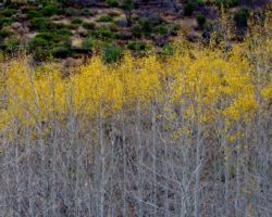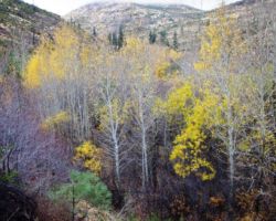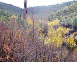 The drizzle came and went and came again, but it was a very pleasant drizzle. The air was very calm, still enough to allow the movements of creatures and birds through the leaves to be heard this way and that. The yellows of tree and shrub and riparian vegetation along the creek below the trail made for an odd division of color; yellow on one side, green on the other, both mutually exclusive and almost universal down the length of the ravine. I was exhausted by the time we reached the gate, having extended my maximum 500 yard range by quite a few furlongs. The thirst raged.
