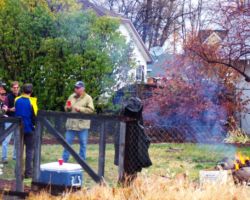By this time, I had lost my steam for tracking down Jan, so we returned to Keir’s place to begin the official cocktail hour and get dinner going. Keir had a cool fire ring so we got a warming fire going out there with some of the redwood Tom brought and Keir split. I set up the BBQ and got a fire going to heat up the pork, onion, and bell pepper brew I made. Although Steve stopped at the store for me on the way over for chips and crackers, I remembered before I left that we had about a million small tortillas left over from the party.
