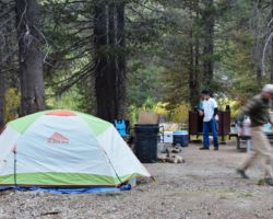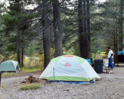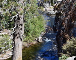 I do recall the insanely steep drive down from the Entrance station at 9176’ down Reds Meadow Road. It was a thrill every time in each direction, especially when we had to maneuver to pass someone or let them pass us. We may have checked Minaret Falls and Upper Soda Springs campgrounds first, but they were full. I recall being relieved, after having driven all this way, and finding the other 2 campgrounds full, to find a nice site along the far upper stretches of the Middle Fork of the San Joaquin River. I remember the young cute camp hostess greeting us and having a nice talk with her about her experiences out here in the high Sierras.
