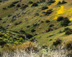 Nonetheless, the extra mileage within radio signals allowed me to hear the end of the story and to see some new country. The unpaved Panoche Road brought me into some spectacular wildflower blooms, and a hill and dale I had never seen before. It cost me time, but it was worth the experience. By then, I had turned to my I-tunes and was listening to new music that I was also enjoying very much. The beverages helped, the grader operator that assured me I could get through, despite the BLM signs to the contrary was a positive, and the vibes were entirely supportive. I eventually picked up pavement, familiar landmarks, and the long end of Little Panoche Road. The temptation to stop at the bar for a beverage was strong, but I needed to connect with the boys.