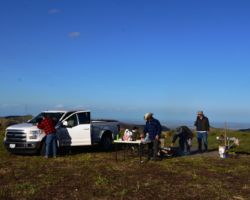 I got a good start on packing up my bed and tent innards, then went out in search of coffee and fire. Tommy was the first out, headed all the way back to SLO. Fortunately, Kevin was kind enough to share some of his coffee brew with me as it barely got me to the first level. I had a great chat with Steve about riding the bike and tires and such, then got to clean-up of camp, and segregating and separating, and scouring. The younger white offspring sheepdog came into camp, shy and cute and submissive, he sort of cowered along the edges until he gained his confidence. Soon he was getting pork chops and chicken breast from my hand and being petted and squeezed regularly. It was great fun to have him visit us, especially since now his tribe was basically at the bottom of our hill, slowly grazing towards us.