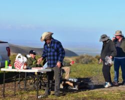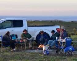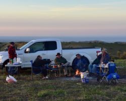 We didn’t tie into any of the provisions we brought on our excursion, so I was hankering for grub when we got back. We got the fire going and soon the grill was again covered in meat; giant pork chops, more chicken, and Vinny made an outstanding skittle of pasta, onion, peppers, sausage, and chicken. I didn’t find it until well after the main course, so I may have been eating it by the handful, but I do remember it was very tasty. Vinny pulled his truck around to block some of the breeze and amplify tunes. The stars obliged, the fire provided, the boys partied on. It was a great night full of lore, laughter, larder, and libations…and sheep.
