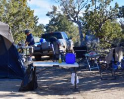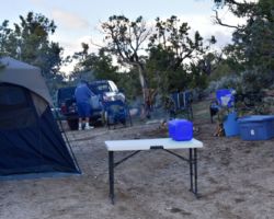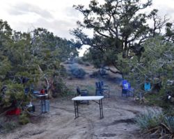 I took another drive around the loop and Bill took another drive around the loop, but we couldn’t find the porthole to the sweet spot, so we wished we could find a great spot without neighbors, with a great view, down an accessible road, with plenty of room, and off we went. Bill stayed behind to keep our space and Tom and I left the campground and headed down Wild Horse Canyon Road in search of options. We hadn’t gone a mile when the truck turned right and up a descent little track we went. We turned left and rose up a steep pitch to arrive at our spot. It was just as we had wished.