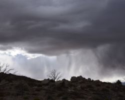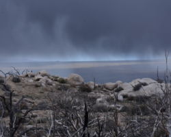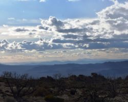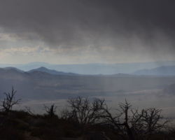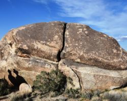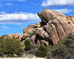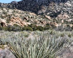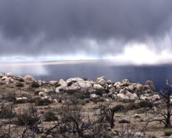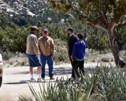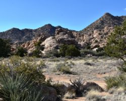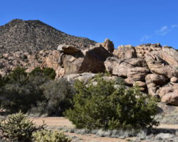 Once we turned around, Tom made a few exploratory runs down fence-line roads. We were nearly back to the intersection of Black Canyon Road which we often drove last year back to our camp. It led to Mid-Hills campground which at least was a destination. So off we went, searching for side roads along the way. There was one truck camped amidst a huge boulder pile which was a great site, but that was about the only site we saw before the campground. Reluctantly, we pulled into the loop, seeing a few occupied sites, but overall, almost as empty as it has been on our previous trips through. That was to abruptly change.