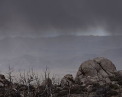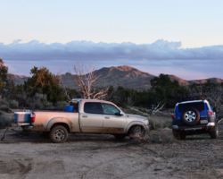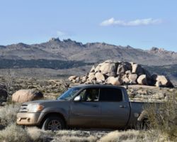 I changed into my SpongeBob bed clothes and slept extremely well. I awoke fresh as a daisy and excited to meet up with Jordan. We had agreed to meet at 11:00 in Cima, or really at the intersection of Cima Road, Cima-Kelso Road, and Morningstar Mine Road, as Cima isn’t really a community any more. After delicious coffee and fire, we headed out about 10:00 and found that, with the sun and the wind, the roads had dried out really well, so not knowing what kind of vehicles Jordan or David were driving, I was confident they would make it into camp. We got to the intersection and there was a huge guy standing next to a brand new Tacoma. I gave him a long look as I pulled up near him. Thank god it was David.