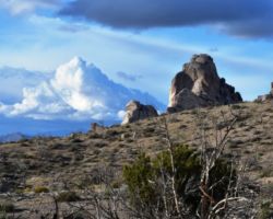 We ventured beyond the end of the road to the base of the most prominent rock formation and sat in the sun, out of the breeze as much as possible. We could hear the boys’ voices from out across the boulder field, but we couldn’t see them. It was time to return to camp, but I lingered behind Tom and Bill, sure that I would eventually see them pop out from behind a rock or rise above a hill below. I kept hearing their voices, just a word or two and certainly each explosive burst of laughter, but I never saw them. I cut down off the road to a route I thought they might take back to camp, but we didn’t intersect. I got to the fire and reheating my root/pork roast brew.