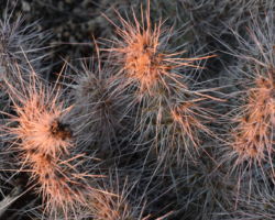 We dropped into a large arroyo, then some rough road, and up the other side. I could recall the images from Googly that we were getting close to the final leg up into Caruthers Canyon where the numerous dispersed camp sites were, but my excitement got the better of me, not remembering to try all the side roads and investigate potential future sites, but rather scurrying down the road to find the end. We did find the end of the road, unlike in past trips, and we debarked to see what was about us. We were way up inside Caruthers, surrounded on the floor by dense clumps of cacti and boulder strewn hillsides all the way up to the higher peaks at near 7500’. This was quite a place.
