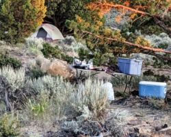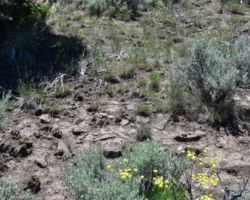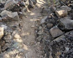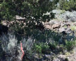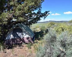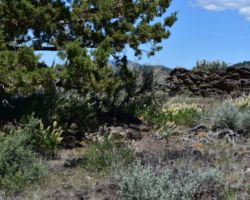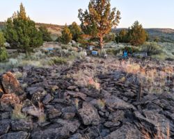 Before I knew it, Bob had made a sweet path from the parking lot to the kitchen area. It was incredible how quickly he did that and how much easier it made moving about. He also stacked rocks into a cairn to mark the trail out to his tent site and out to a further Juniper where he hung his solar shower. These were really the first “improvements” made up top, and really motivated me to get into it and make it work. However, our main objective was to put up a fence across the road down by the cemetery.