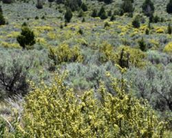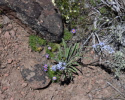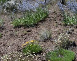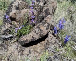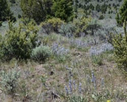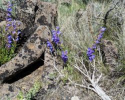 The property had more flower color than I could possibly have hoped for. The triangle road on the way in had nothing but color in the center between the tracks. Large bushes of yellow flowers covered the hillsides – Rabbit brush, Bitter brush, Deer brush or some such bush. Lupine of blue, yellow, and white was clumped in the shade under most of the Juniper. The open rocky spaces were covered in tiny, delicate wildflowers, some in small circles like flowering fairy circles.
