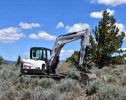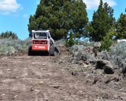 The winter lasted a while longer than we had hoped being so anxious to really get out on the property and stay a while, and that time finally came in June when Mike returned to put the road in. It was super exciting to return to our camp spot just above the cemetery, knowing, hoping, our future camp would be up top after we got this road in. Mike came up the triangle road in a big rig with full length trailer and 2 pieces of equipment; a small excavator and a Bobcat. The angle of the intersections with the triangle road, the border road, and our road up the hill alongside the cemetery is very sharp so there was no way the big rig was going to even come close to making the turn. Mike plowed his way off-road up through the sage brush and made quite a mess before finally getting stuck.