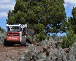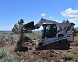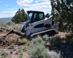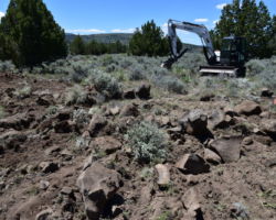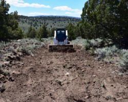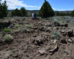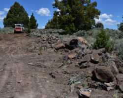 He offloaded the equipment, made a huge swath through the sage, widening the road by three or four times, and began blasting up the hill. The first third or so of the distance is really soft, fine soil, almost powder, so he literally was just plowing sage brush and moving a little soil. The upper half though, we knew was a massive rock field the entire width of the hill. We had searched and searched for a better route to the top, laying out three or four flag lines before finally realizing none was better than the other, so a straight shot was probably best.