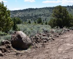 When Mike came back for day #2, he got up to where we had identified the only really massive boulder, probably 4’x 4’, what we could see anyway. By the time he was done Mike had unearthed a half dozen of those sized boulders, hundreds of rocks half that size, and hundreds more basketball sized and smaller. His route was straight, but not a super straight line such that you could stand in one spot and see the whole length. It meandered just enough to not be able to see the road for very long before it bent slightly one way or the other. It headed straight up to where we wanted it to come out, but had just enough variation to it to really soften the impact. Our ancient Juniper stump, that reminded me of the scene in Patton where George C. Scott is standing on the tree stump to direct the tank column in the Italian mud, that was once a real central spot all the various flagged road routes diverged from the lower rock-free portion of the road, was now just a stump among the rocks along the roadside.