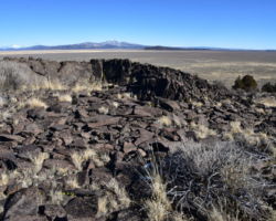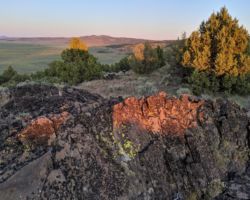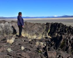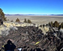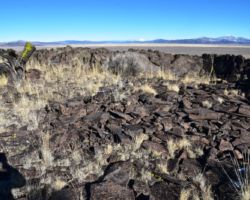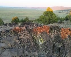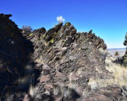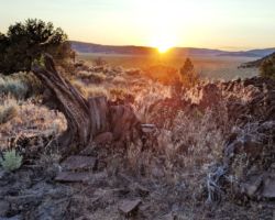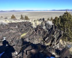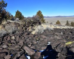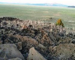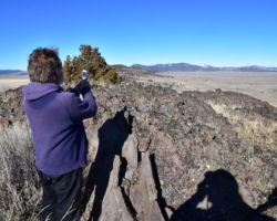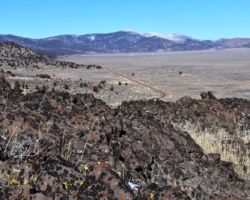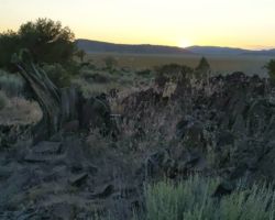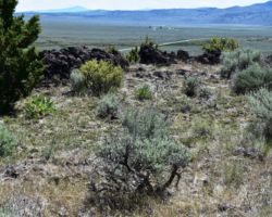 The cemetery was a bit odd at first, but the size, sage, Junipers, top of the hill, the view, the privacy, the quiet, the rock formations, the birdies; everything else was incredible. Mike was getting a real good vibe from it, and so was I. We walked up from the cemetery through the sage and past all the Junipers, up to the top of the hill. When we first saw the spectacular vertical rock formations, I was blown away. Mike followed through a little pass in the formations on the East side, and we got on top of a solid rock flat; the flat pieces clinking like glass below our feet. When we got out to the cocktail lounge, another 30’ x 30’ flat of hundreds of flat lava pieces in front of a vertical lava wall about 3’ tall on the point of the property looking Southeast to the Warner’s, Eagle Peak, McDonald Peak, Observation and Spanish Springs Peaks and a couple hundred feet above Madeleine Plain with a 360 degree view, we knew this was a very special place and it had just about everything in a piece of land we were looking for (plus a cemetery!).
