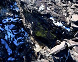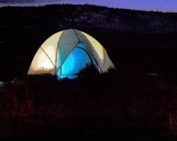 Bob and Steve arrived just as they were leaving. Mike and Wren were happy to walk out to their truck, not wanting us to risk driving out on the soft, slushy snow. Bob got up to the camp with no problem and they got set up in short order. We had a great dinner and fire after the afternoon breeze died down. Sleep came very early for me, as did the morning. Even though Mike had minimal gear, and crappy stuff at that, including a useless sleeping pad, he was a huge trooper, not complaining or too thrashed from not only camping for the first time in years, but in freezing cold temps. Again, it was calm and spectacular. We did some measuring and finding corners, wandering around the top, and hanging in the sun, sitting under the wind at the “lounge”. We left some briquettes, poles, wood, and a grill on the property for the first time.