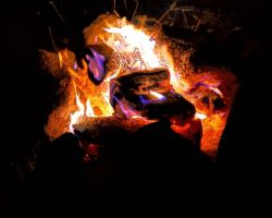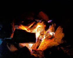 That night, the breeze calmed early so we had our first fire up against the rock formation. After a few pops, and crackles, and explosions, we had to admit that the rock was superheating and blowing out at us. We had experienced this before, so we knew this was not going to work. We dug out a hole as best we could in the rock and set the bottom of a Weber BBQ, and thus we had our sunken fire pit.
