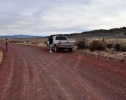 The morning of the second day, we headed to Likely to see what was there and I showed Mike where I used to get my mail. Mike dropped me off on South Grasshopper road so I could search for the mid-Western BLM Monument that is supposed to be out in the pasture. While I was out there wandering around hunting for the marker, a white truck pulled up alongside the fence. I knew I should head over to introduce myself.