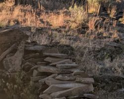 We soon realized this was going to be a job. The weather was great; not hot with a nice breeze, but the fencing was alternately buried in the ground or grown over by sage. We soon needed the axe to break off stout branches of sage to allow us to pull out the wire. Often times where the wire was buried, it rusted enough to break, so we found numerous sections that had varying numbers of strands. We would free a significant stretch of wire and then lift it over the sage to get it out nearer the property line as we saw it. We made it down most of the way, just about onto the flat ground at the bottom, when a white pick-up appeared on the road.