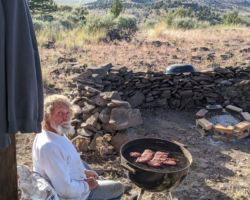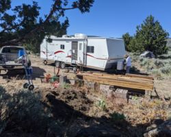 At any rate, we were done; both with the job and energy expended. It was time for rest and refreshments. Mike soon found his way to the trailer and I was jonesing for a shower. I was a little concerned about when the neighbors might roll up the hill, but I needed to be clean. I got all my gear together and clean clothes and cleaned up by the kitchen, and sure enough, up rolls a rig. I scrambled behind the kitchen to get clothes on and didn’t respond to Dale’s calls. Fortunately he headed to the trailer and woke Mike up, which gave me enough time to get dressed, just as they came up the trail. Dale quickly figured what had happened and we had a good laugh.