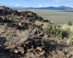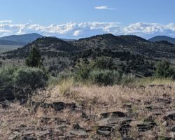 I headed up the mid point on the eastern side and tried to eyeball the alignment of the old wooden fence posts and the new line flagged by Leo when NST did the survey. It all seemed fairly reasonable so I just went with it. The first 300’ or so, South from the center point was super rocky ground. I can’t see any rig getting through there. It rises slightly before dropping off fairly steeply to the corner. From about the 300’ mark, the slope increases and the rocks disappear, making it reasonable to fence this 1000’ or so from the corner to the top of the hill and the transition to the rock. Mike and I began pulling the wire still remaining from the old fencing.