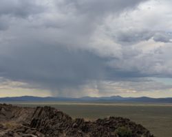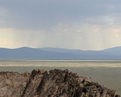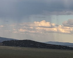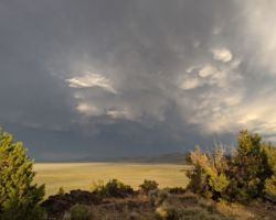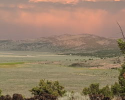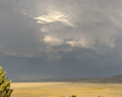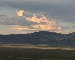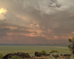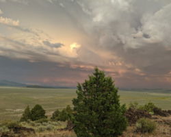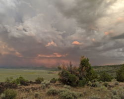 Periodically, I would remember to turn West and be reminded of the slender crescent moon setting in the gorgeous blue green Western sky. It was so calm and tranquil out West, so clear and soothing. One turn of the head to the East and I was fearing for my safety. The darkness of the clouds was intimidating; the bursts of lightning both entertainingly awesome and terrifying. I was looking for fires, listening for the thunder, concerned about the blasts of wind. I played my entire “Killers” library and finished my bottle of Zin. The storm was moving North behind McDonald Peak and seemingly joining another front to the North. Together they hammered the Warner’s and points NE. The show continued for four hours until I couldn’t stay awake any more. I had to get some sleep to prepare for the day ahead.