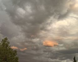 The percentage of the Eastern sky that was dark and stormy was increasing significantly. My eyes were glued to the size, darkness, and proximity of the mass. The wind had picked up considerably and I was evaluating options of running away screaming, curling up in a ball on the floor of the trailer, sucking my thumb inside the truck, or putting my diaper on and sitting it out. I drank more wine and took a few pictures and decided to stay put on the kitchen deck. I put on some calming music and looked West from time to time to stare up at the huge clear blue sky. It began to rage.