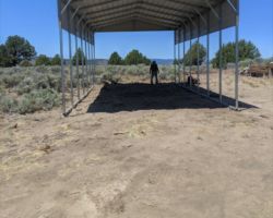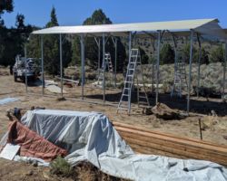 Be that as it may, the morning was calm and cool and we had coffee, fruit, and cereal, before I noticed Bobby hoisting his tool belt on. Let’s get it on! Bob chose the full length floor joists he wanted and we got them installed. Jenny had unrolled some chicken wire I brought up last time so we cut that into strips, then got to the 2 new rolls I brought up. We used every inch and had none left over. Then we headed down to the bone yard and grabbed an insulation burrito. We used every bit of the insulation wrapped up in that tarp and again didn’t have a shred left over. It was stunning how well things were falling in place. We stopped for a break and Bob was bemoaning his shorting the estimate on the plywood we needed for the flooring. He kept saying he couldn’t understand how he figured we only needed 3 sheets.