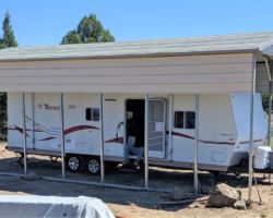 The full sheets went on fairly reasonably, but the smaller ones were definitely a grind. Each staple and trimming, seemed far more laborious than it should be. We found our groove, but it was still a grind. The second layer of 1/2” plywood for the roof was voted down, and thus our work day ended. We took some time to marvel at our accomplishment, the quality, and the sheer cabin-ness of the structure. The slope of the roof and the location fit really well with the trailer and the cover. The deck would really tie it all together.