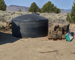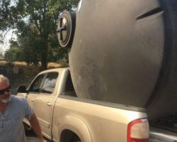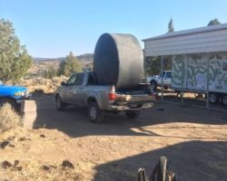 Steve came up with me as we stopped in Red Bluff at the Tractor Supply to pick up our first 1100 gallon water tank. The forklift lady loaded it into the bed on its side as we had asked, but this turned out to be problematic. The tank is 87”x53” so it rose high above the cab in an irregular orb. We had to stop 6 or 8 times to re-strap the tank, tighten the ratchets, or reroute things entirely. We never lost it onto the highway, but she traveled all over the bed, side to side and front to back.