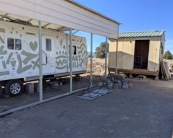 This was going to be a little tricky because it had to be moved back over the base of the RV cover and we couldn’t get the truck behind it to pull it. It wasn’t going to be pulled into place, it had to be positioned by hand, but the boys desperately wanted this activity badge, so off we went. We got the truck in place and lifted the front end off the ground. The boys filled the hole with smaller rock and gathered a load of soil. After much pry bar work, and back and forth and using wood to slide it into place, and removing the wood and leveling front to back and side to side and much input and scratching from everyone involved and less involved, it finally found its spot. All were satisfied.