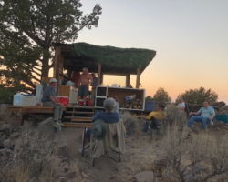 I was working on the last 8’ post when the boys returned from their adventure. I was exhausted and filthy, so the timing was perfect to call it good and hear the tall tales of the day. I took a great warm shower off the back of the trailer which has become my “go-to” spot. After a beverage or several, cleaning up, and a change of clothes, I felt like the next concubine at Bukkake Way. Tommy was in a Manhattan way and, before I could straighten out all my gray curlies, he and Kenny were dragging the bar to the lower terrace. Soon the band was complete and a huge “hurrah” went up to the god’s for all that we are grateful for.
