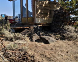After a nice break in the shade of the trailer, and with Kevin back to provide even more advice and commentary, I successfully suggested we engage in the final activity of the day, the massive boulder relocation. This was a huge boulder the RV cover guys and I dislodged out of the earth when they erected the cover. It had a cool concave top side with a slight depression enough to hold water or melted snow when the time came. I wanted to use the huge stone to weigh down the RV cover on that all-important NW corner, but also to incorporate it in the deck building and hopefully catch and hold some water.