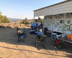 The truck was extra thirsty this trip, so we got gas again in town before heading out 139. With the stop in Red Bluff, gas stops, load maintenance stops, Steve falling out of the truck, and the detour, it took us almost 8 hours to get up to the property. It was awesome to come up the hill and see 4 rigs up there already and be greeted by Mike, Tom, Bill, and Kevin as opposed to me almost always being the first up. It was awesome to see the guys and have such a great sense of being together in addition to the relief of finally making it up top with our load in place. It was also great to just be able to open the trailer door and throw my bedding and clothes inside and be done. Steve set up in the cabin and we were ready to unload and get into a better space.