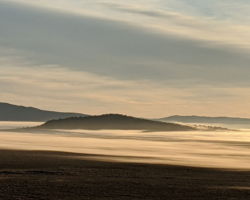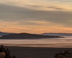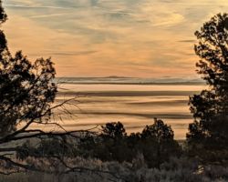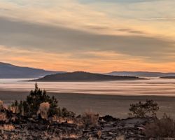All 3 of us showered in the trailer this time. The water was a little short for 3, but we made do. I had the fire going and put on a Mark Knopfler album for the boys to enjoy while I showered and they chatted away. My brief rinse allowed me to get back to the fire in time to cook up Mike’s 2 steaks as Bob whipped up some pesto pasta. It was outstanding. I brought Bob down below the rock outcrop shelf on the Eastern side to show him a potential cabin spot and we basked in the warmth of the late sun and cocktails, tripping on the rock, the colors in the lichens, the vista out over the Madeleine Plain and up into the Warner’s. The air was incredibly clear; such a vast difference from all the smoke-filled days we had.