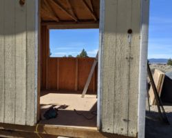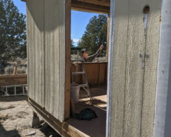 We then had trouble with the generator as it seemed the battery just wasn’t strong enough to kick it over. Fortunately, Mike was able to loosen the straps, turn it around to reveal a pull start. One tug and we were back in business, for a while anyway. We got the big Western glass in place and Bob got going on the glass door. Mike and I were going after all the trim and we were finding our groove, when the generator cut out again. This time, it seemed out of gas, but fortunately Bob had his battery operated circular saw which saved the day.