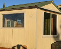 I was making trips to the bone pile for the slider window and sections of paneling to build a skirting around the bottom of the cabin walls. Mike was helping Bob cut out the sections of the walls for the window. We ran into trouble with the height of the massive southern window, but that was quickly rectified and we got her into place. They got the hole for the stained glass window resized and then we were ready for the horizontal slider on the West side.