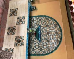 Upstairs and then up another flight of stairs, we came out onto a balcony which led to a very private courtyard.  We again were facing East and I assume a couple floors above the dining room.  There was a beautiful tiled fountain, bar, and potted plants all around.  It was covered to provide shade and would also be an excellent location for a reception.  We got to tour a couple rooms to show H&B the accommodations and rooms they could rent to stay, get ready, and use for guests, etc.  It was very cool being led around to a number of patios, decks, and open spaces that could be used for any number of wedding related events.
