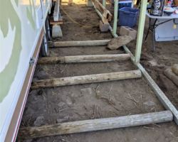 Suddenly, Mike had a counter proposal. Rather than leveling the deck, what about raising the trailer. It seemed like we were always 1.5” off. If we went around the trailer and placed another 2×8 piece under each block currently supporting it, we could be in business. I just about lost my shit. I did not want to start on an entirely new approach, that was not simple nor easily achieved, and I was not convinced that it would solve or even reduce any of the work with leveling and piers and such we were trying to do just with dealing with deck heights. We discussed this new approach for quite a while, and eventually agreed not to pursue it.