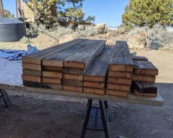 I grabbed the peeler posts and cut them to length with the sawzall because I couldn’t get the stupid chain saw to start even though I used it the day before. So frustrating! I laid them out on the ground spaced about 2 feet apart so that we could have a step or 2 down to more deck, or like an old wooden sidewalk to the back of the trailer. Eventually, we hope to place a shower platform at the back of the trailer for the outside shower and it will all connect with the decking.