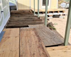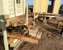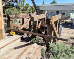 I was impressed that it was so easy to access, under a cabinet that was otherwise empty. Mike went in to Susanville to get another pump while I focused on the deck. I bought a new mattress for the Mike to use in the trailer, wanting to eliminate the one that our crook slept on. We kind of wrecked the beams for the deck that we had set in place last trip getting it in the trailer, and we had also moved the corner deck support last trip in order to drain the cabin water tank, so I had to get a lot of the beams and supports back in place before I could begin screwing at altogether. I was torn between double checking everything we did last time, triple checking level and re-measuring over and over. Once I began screwing things together, it felt right, so I went hard. Once I had the inside beams, those closest to the structures, attached to the piers and to each other, I began to get the outer beams in place. With a little tinkering and scrounging, I was soon back to where I thought I would be beginning.