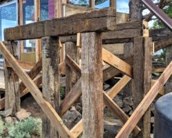 We fired up the new generator and marked the posts and that little McCullough saw hacked away at the massive 6×8 weather hardened creosote soaked railroad ties like a tiny aggressive beaver. I was amazed at how it clawed through the top of the first post and then the next and the next. I was sucking in creosote dust and sawdust, but we were going great guns. It was really something to see all the posts at height, braced, and stable as hell, even though they were just sitting on the ground. We couldn’t help but heave the 2 matching railroad ties up top of the posts for the horizontal beams, but we didn’t have a matching 3rd, and then we realized we didn’t have a midpost on the West side. Oops.